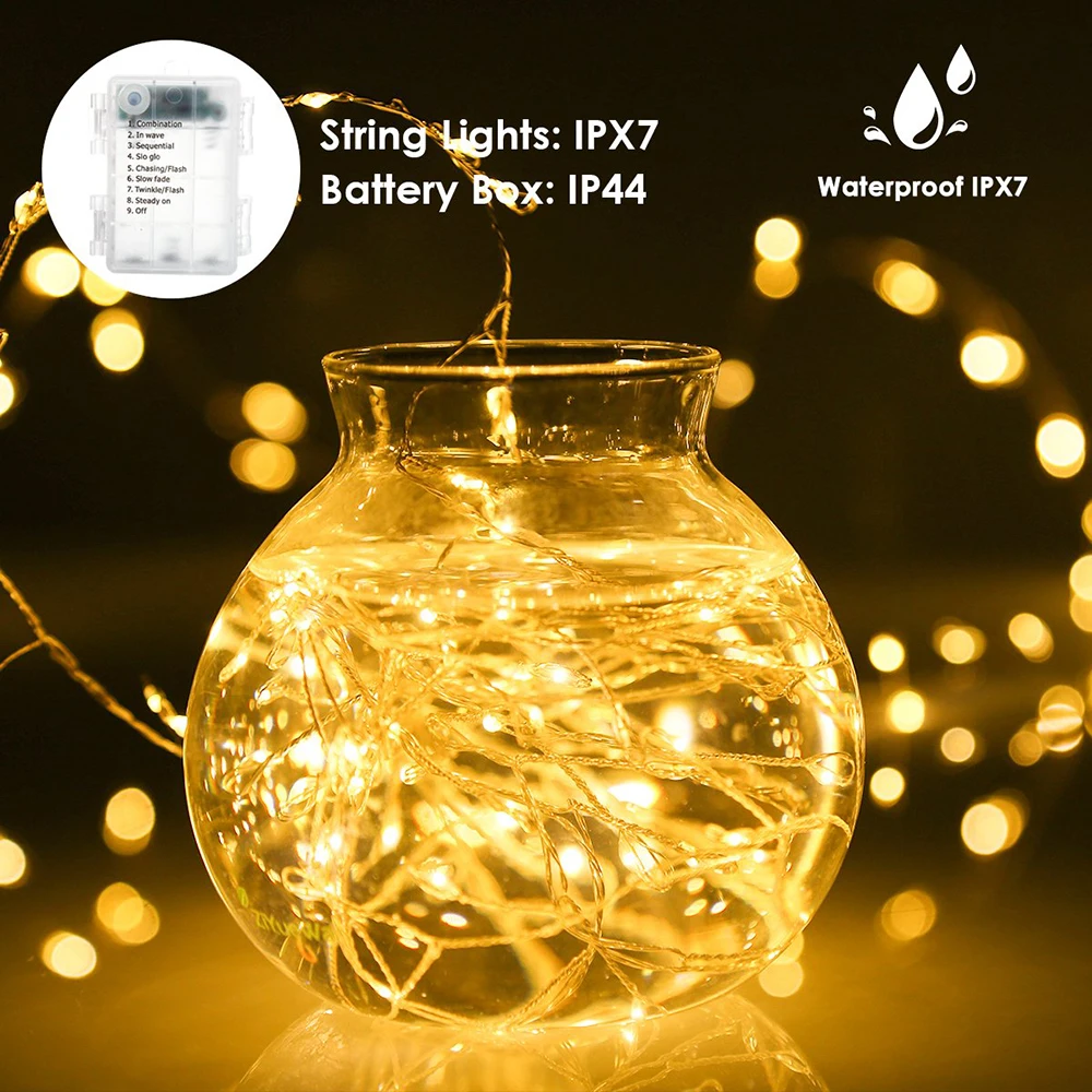 【 IP65 Водонепроницаемый 】провод части светодиодный гирлянды является IP65, что очень удобно использовать на открытом воздухе, даже вы можете разместить его под водой, USB не является водонепроницаемым, аккумулятор Чехол является IP44, нет никаких проблем с помощью аккумулятора чехол в дождливые дни, но, пожалуйста, примите во внимание, не ставьте его под водой напрямую.