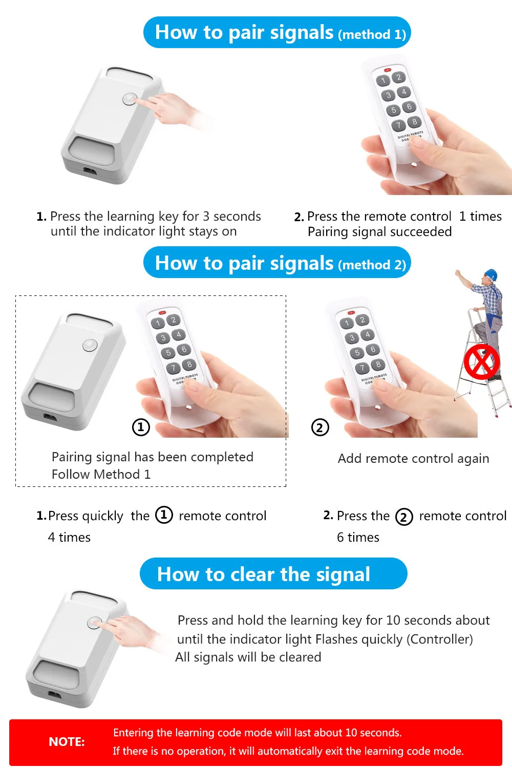 Метод 1: 1. Нажмите и удерживайте клавишу обучения в течение 3 секунд, пока светильник индикатора не включится (контроллер) 2. Нажмите на пульт дистанционного управления 1 раз 3. Индикатор светильник (контроллер) мигнет дважды 4. Сигнал сопряжения успешно Примечание: Вход в режим кода обучения продлится около 10 секунд. Если операция отсутствует, он автоматически покинет режим обучающего кода.