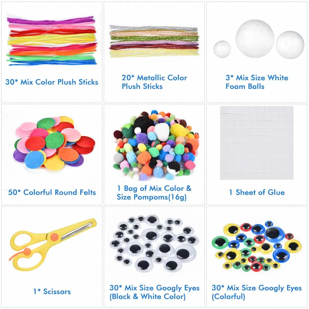 Особенности: 1. Все-в-одном товары для искусства и ремесел содержат различные материалы ручной работы для удовлетворения различных потребностей проектов DIY, вы можете полностью позволить своему воображению пробежать в дикой природе и превратить творчество в Потрясающие и уникальные творения. 2. Может использоваться для продвижения инновационного мышления, повышения концентрации и укрепления практической способности для комплексного развития ваших детей. 3. Идеальный подарок и идеальная развивающая игрушка для ваших детей, они могут легко создавать удивительные вещи самостоятельно или с друзьями и семьями, чтобы веселиться вместе. Технические характеристики Материал: полиэфирная пряжа + железная проволока, акрил, пластик, перо Цвет: смешанный цвет Длина плюшевой ручки: прибл. 29 см Диаметр круглого войлока: прибл. 2,5 см Диаметр шарика из белой пены: прибл. 3 см, 2,5 см, 1,5 см Посылка включает в себя: 30 * разноцветные плюшевые палочки 20 * металлические цветные плюшевые палочки 50 * красочные круглые войлоки 30 * смешанные размеры глаз (черный и белый цвет) 30 * смешанные размеры глаз (красочные) 25 * разноцветные турецкие перья 1 сумка разных цветов и размеров помпонов (16 г) 20*25 мм разноцветные маленькие деревянные зажимы 70*6 мм Разноцветные Кристальные алмазные наклейки 2*А4 Размер Felts (случайный цвет) 1 * ножницы 12 * Разноцветные перья 3 * смешанные белые шарики из пенопласта 1 лист клея