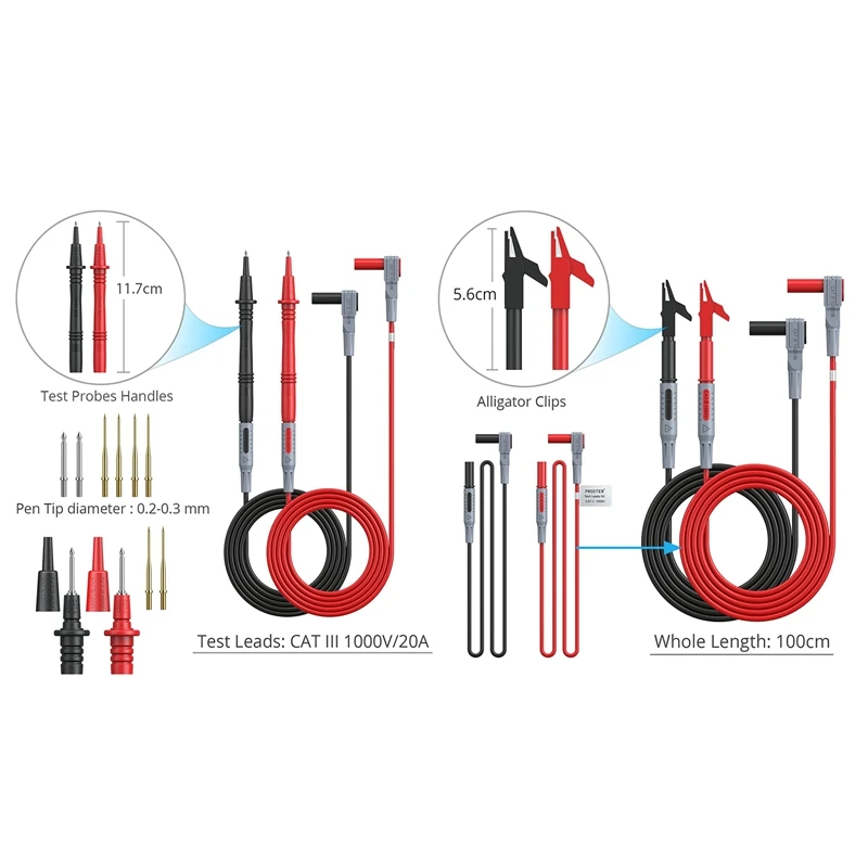 Подходит для мультиметра/Клещи для расширения возможностей тестирования и гибкости для школы, лаборатории, электрика, Etc.1000V/20A --- Максимальное входное напряжение/ток тестовых проводов и штырей зонда составляет 1000 В/20A. Максимальное входное напряжение/ток небольших зажимов типа «крокодил» составляет 300 В/15А, а большие зажимы типа «крокодил»-1000 В/32А