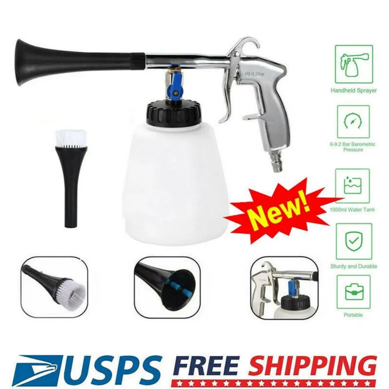 Our Car Cleaning Sprayer adopts PP plastic and aluminum alloy, lightweight, abrasion-resistant and durable. Equipped with a 1000ml water tank and snugly fit handheld design, which let your easily grip it and control the output level of spraying via adjustable valve (Note: You need to equip an air compressors with the 6Bar/87Psi minimal constant air pressure, air tube, etc..). Adopts advanced cyclonic cleaning technology, faster and easier to clean your car on all details than using brushes or swabs. Easy to use and widely used in cleaning a car interior or exterior, such as door jams, leather car upholstery, cup holders, consoles, shifters, door panels, and seat belt retractors, wheel surface etc.
