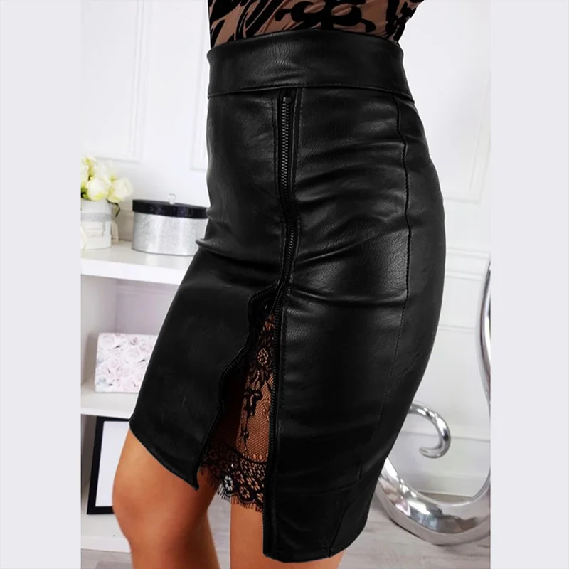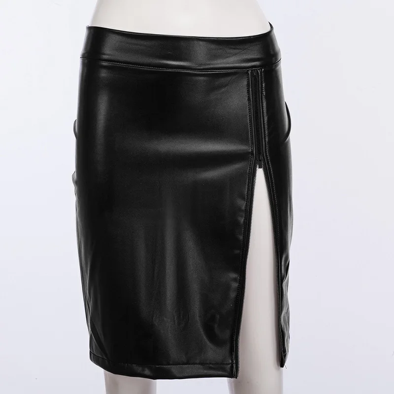 Юбка из искусственной кожи однотонного цвета, с высокой талией, застежкой-молнией сбоку и сзади, а также с изгибом, что делает вас сексуальным и привлекательным.