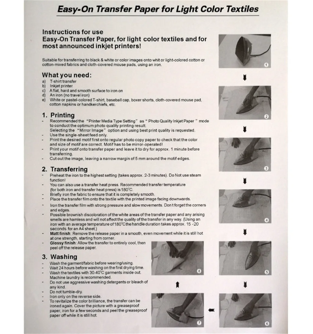 Во-первых: печать 1. Настройка принтера. Рекомендуется выбрать режим «качество фото струйная бумага» для удовлетворительного Результат печати. 2. Печать желаемого изображения На переводную бумагу. Затем Оставьте его высохнуть около 10 минут 3. Вырежьте изображение, Оставляя Узкий край 5 мм по краям узора Во-вторых: передачи 1. Подогрев теплового пресса Установка и установка рекомендуемой температуры передачи до 165 °C 2. Снимите основание Бумага Из напечатанного покрытия, и покрытие останется как пленка Материал 3. Поместите покрытие изображения На текстильной, напечатанной (изображение) стороне вверх 4. Положите изоляционную бумагу На изображении блестящая лицевая сторона вниз 5. Передача для 15-30 Секунд, затем извлеките текстиль из машины, очистите изоляционную бумагу После охлаждения. Третье: ручная стирка 1. Лучше не стирать Текстиль в течение 24 часов после передачи 2. Стирка текстиля Холодная или 30-40 °C вода. Не стирать при температуре С сильно щелочную реакцию Моющие средства, не отбеливать. Избегайте трения Передача узор в тех случаях, когда Ручная стирка. 3. Не отжимать, сушить в линии В тени рекомендуется 4. Не подвергать химической чисткеПримечание: