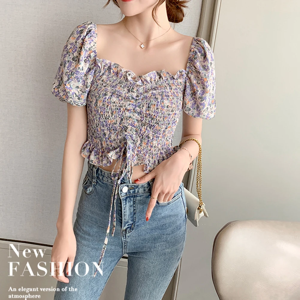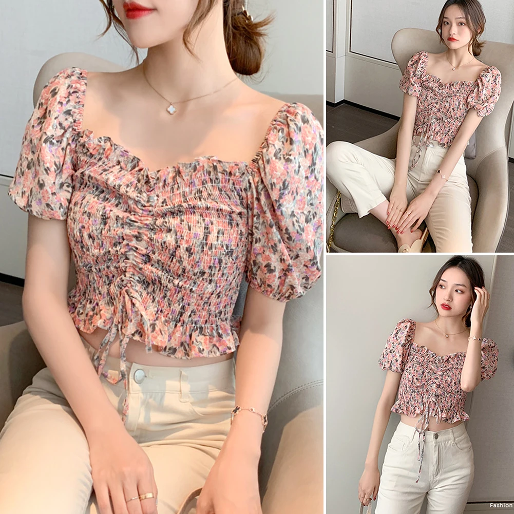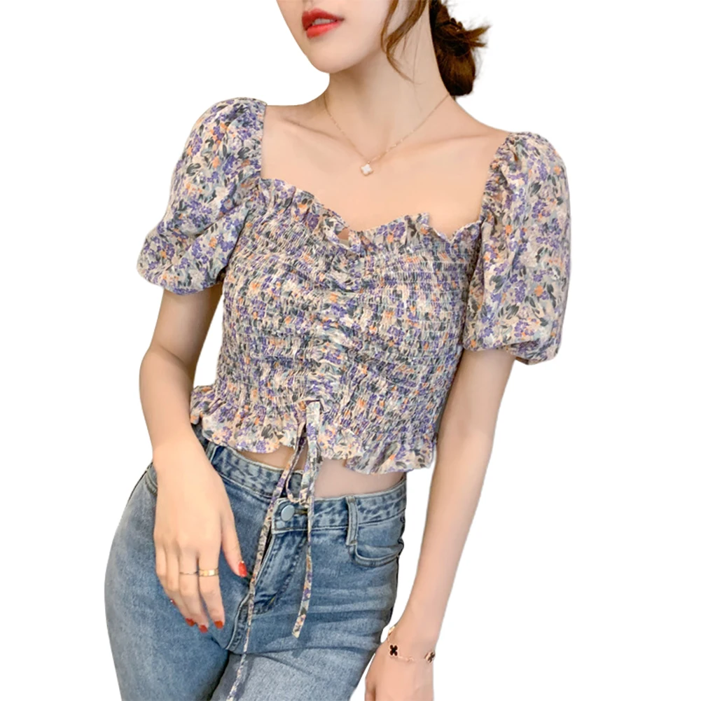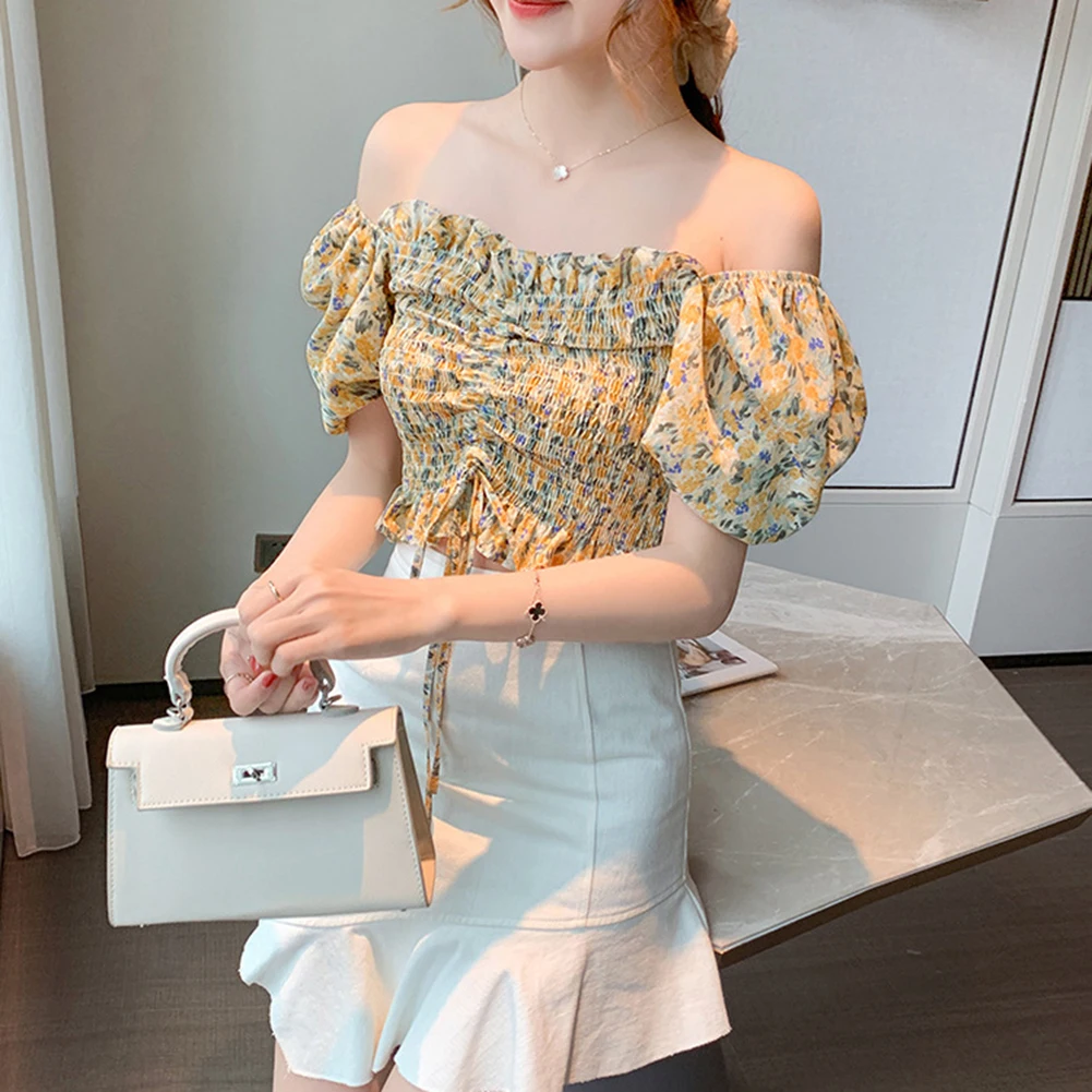 Женский летний сексуальный укороченный топ с открытыми плечами и цветочным рисунком из шифона