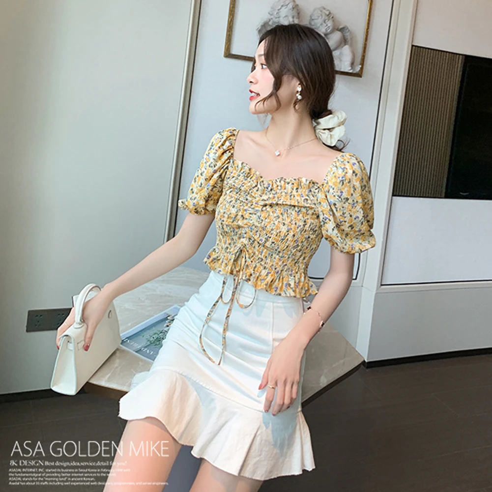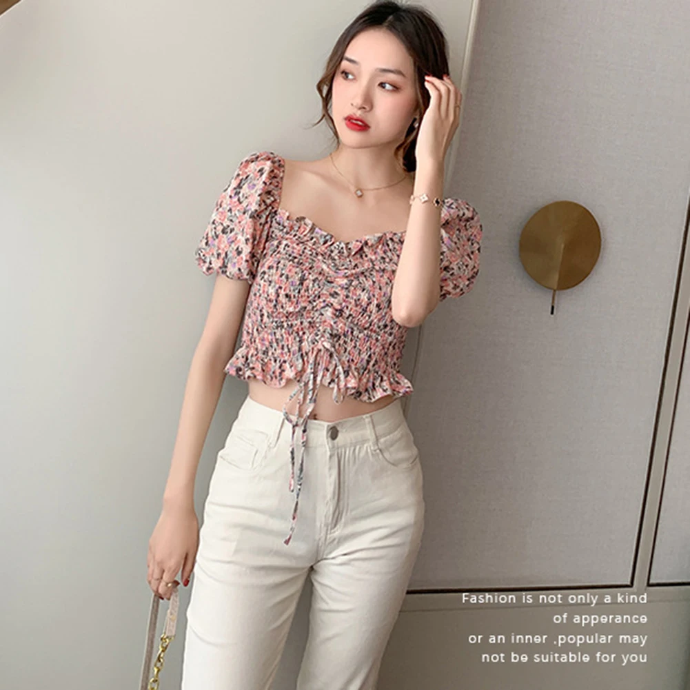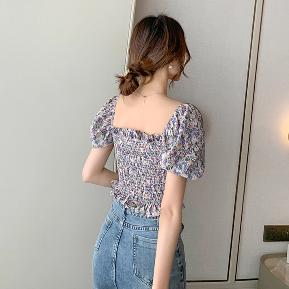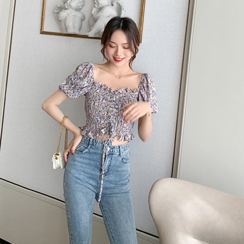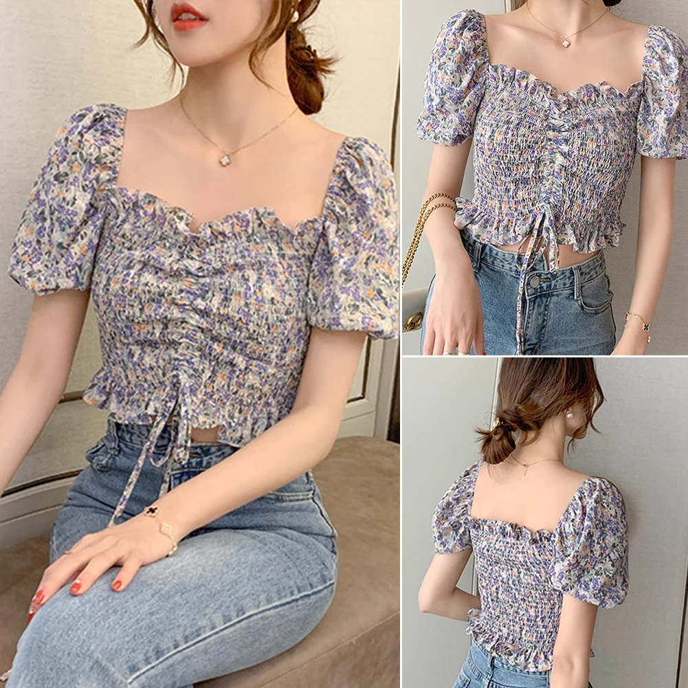 Женский летний сексуальный укороченный топ с открытыми плечами и цветочным рисунком из шифона