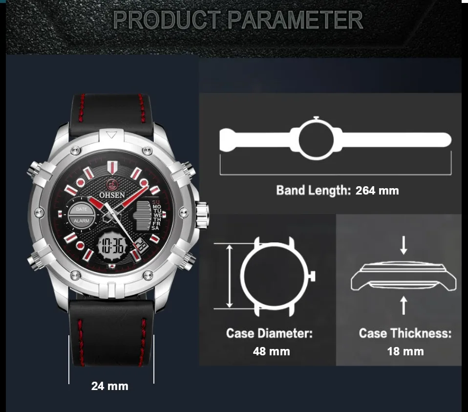 Материал корпуса: сплав Чехол: 48 мм Чехол: 18 мм Группа Материал: кожа Длина ремешка: 264 мм Ширина ремешка: 24 мм Тип батареи: японский Maxell CR2025 Глубина водонепроницаемости: 3ATM