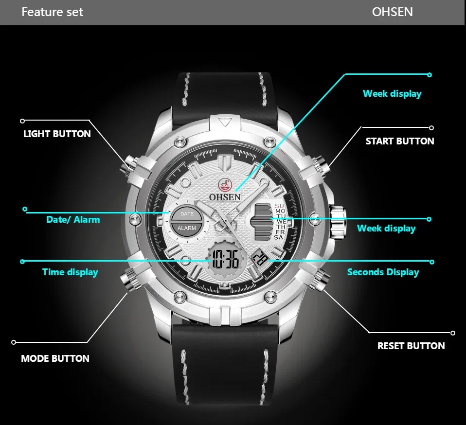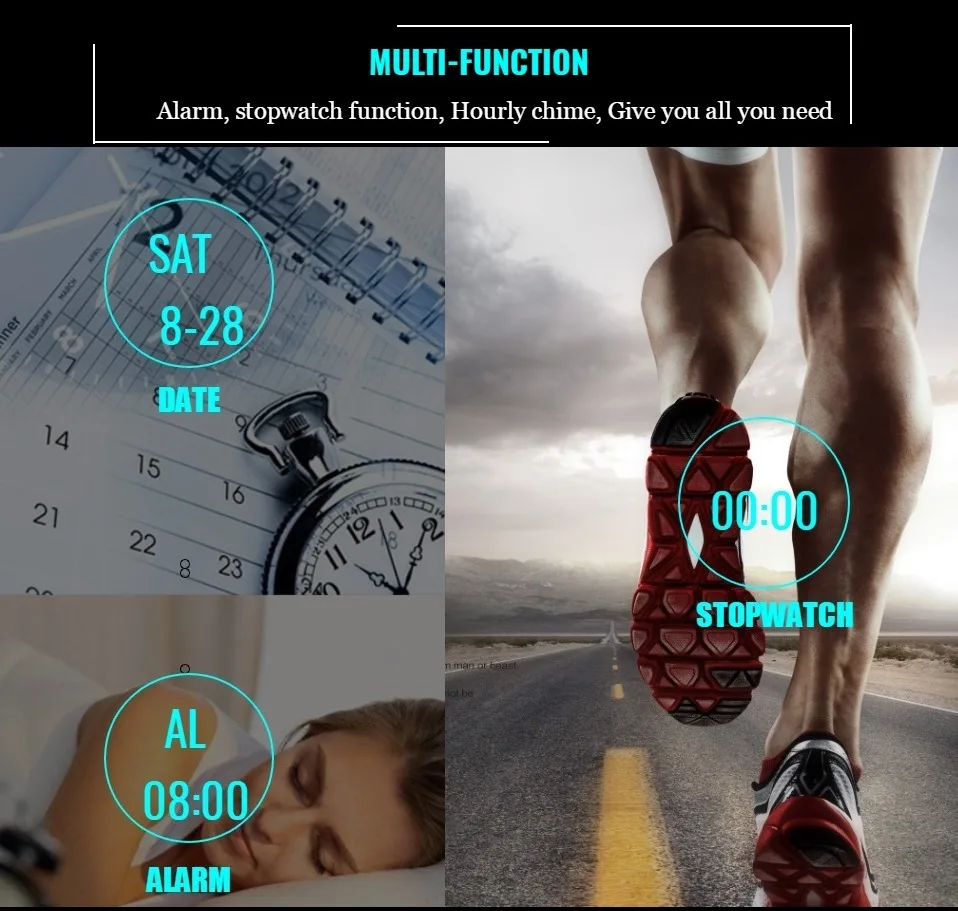 С двумя часовыми поясами Дисплей Цифровой дисплей: часы, минуты, секунды, pm, месяц, дата, день 12/24 формата отображения времени Функция будильника и ежечасного звонка Специальный дизайн с хронографом (секундомером) с шагом 0,01 секунд Водонепроницаемость до 30 м (не нажимайте кнопки в воде) Дополнительные ЖК-дисплей задняя светильник функция отображения времени четко в темноте