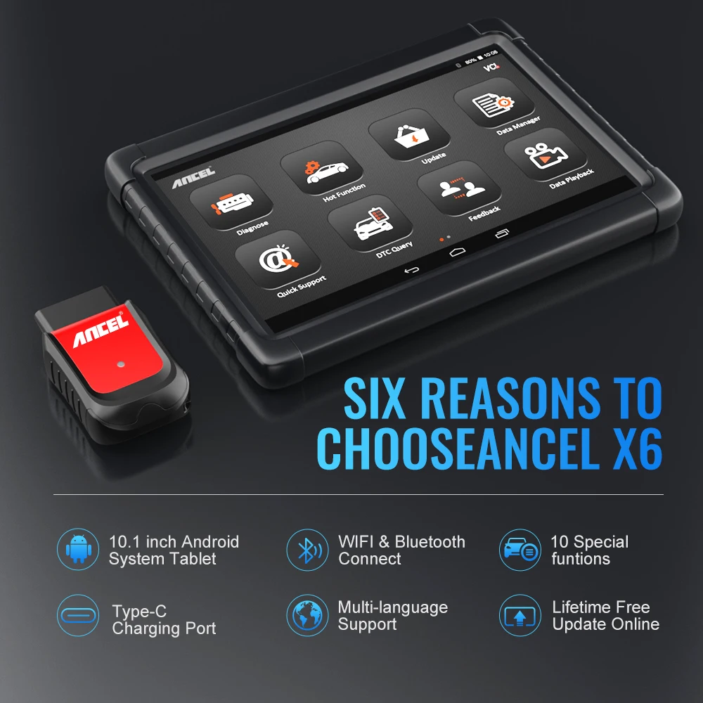 ANCEL X6 является последним устройства на базе Android инструменту диагностики по OBDSPACE технические, можно сделать мощный автомобильный Полный система диагностических функций, также можно с помощью функции, такие как сброс, кодирование программирование. Поддержка более 78 отечественных, европейских, азиатских, австралийских и китайских автомобилей. А также поддержка нескольких языков программного обеспечения, он может сделать один клик обновление онлайн неограниченная по времени, также поддерживает онлайн-поиск DTC коды и советы по техническому обслуживанию вилла отвечает требованиям заказчика в отношении и будет лучшим выбором для автомобиля технического специалиста владелец автомобиля и диера энтузиастов и т. д.