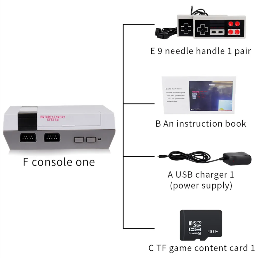 Характеристика:1. Встроенный 1000 игр, если вам нужен список игр, пожалуйста, свяжитесь с нами2. С 2 контроллерами вы можете наслаждаться игрой с друзьями и семьейУпаковка: упаковано в оригинальную упаковку boxbrand newСоветы: отличный выбор подарка на день рождения, Рождество, День благодарения и новый годСпецификация:1. Подключи и работай.2. Встроенные игры, поддержка загрузки игр, сохранение игры!Посылка включает в себя:1 * консоль для видеоигр2 * геймпад1 * av-кабель1 * Руководство пользователя1 * Адаптер переменного тока (Мы предлагаем адаптер переменного тока для ЕС или США, пожалуйста, укажите, какие типы вилок вам нужны после размещения заказа, в противном случае мы отправим случайным образом)1 * TF картаПримечания:Возможна погрешность в 1–3 см, связанная с особенностями измерения вручную.Из-за разницы между различными мониторами изображение может не отражать фактический цвет изделия. Пожалуйста, поймите, спасибо!Фото