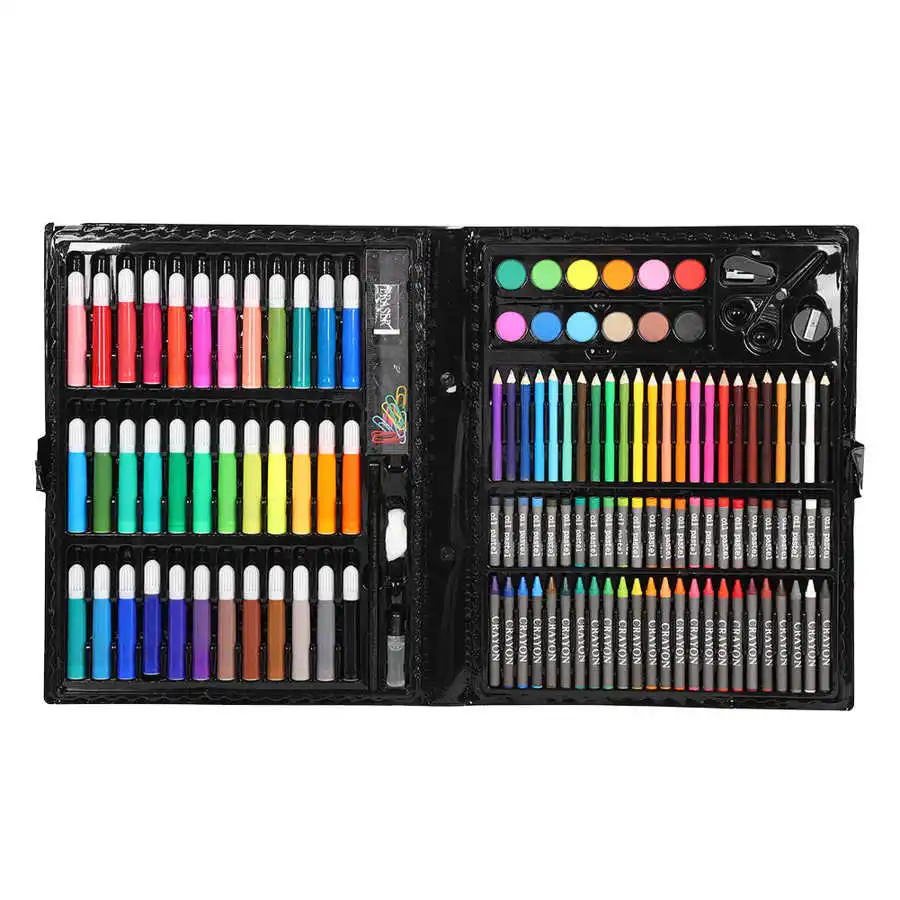 1 х подарочный набор в коробке (В том числе цветная ручка x 36, цветные карандаши x 24, восковые палочки x 24, цветной карандаш x 24, порошковая краска x 12, зажим из пластика для бумаг x 12, линейка x 1, карандаш x 1, ластик x 1, точилка для карандашей x 1, пластиковые ножницы x 1, кисть для краски x 1, Лоток для краски x 1, клей x 1, губка x 1, степлер x 1)