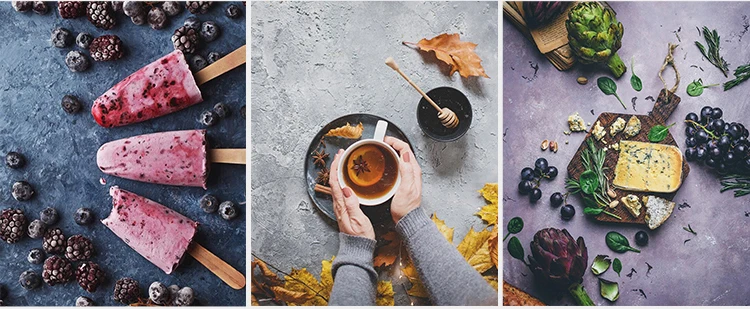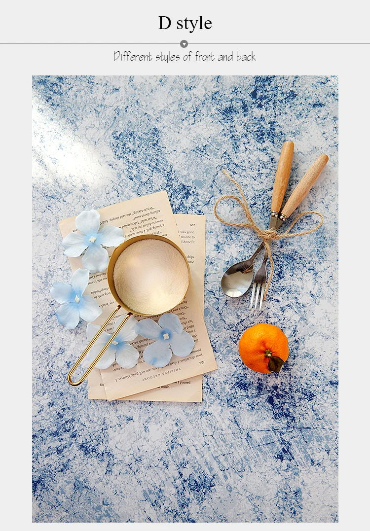 Материал: бумага с слоем ПВХ-пленки на поверхности, водонепроницаемая и Пыленепроницаемая, может быть протерта влажной тканью, но не может быть замочена в воде. Фотобумага подходит для еды, десертов, косметики, ювелирных изделий, нефрита, антиквариата, игрушек, подарков и так далее Размеры: 54x82cm Продукт Особенности 100% новый товар высокого качества. Изготовлен из толстой бумаги с покрытием с двусторонней пленкой и водонепроницаемой поверхностью. Передняя и задняя стороны имеют различные рисунки, которые очень подходят для фотографических фоновых аксессуаров.