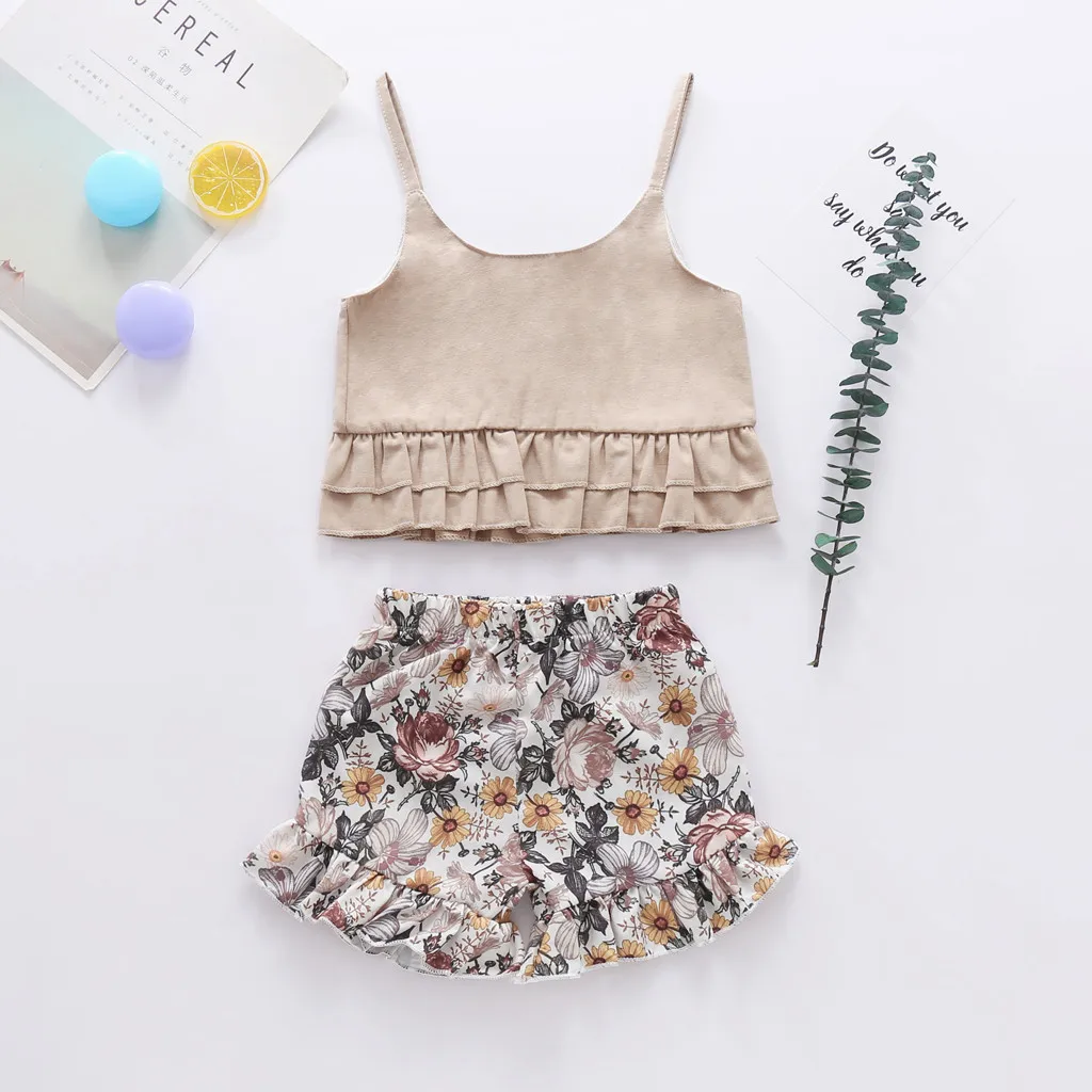 Летний жилет с рюшами на пуговицах для маленьких девочек, топы + Цветочный комплект с шортами