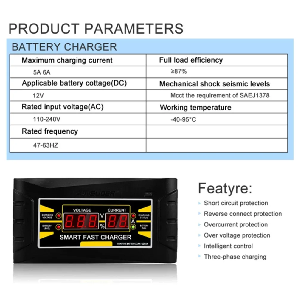 Материалы: пластик + металл Тип батареи: аккумулятор переменного тока Применимый аккумулятор: 12Ah-100Ah Ток зарядного устройства: 6A Входное напряжение: 150-250 В Выходное напряжение: 12 В Номинальная частота: 47-63 Гц Полная эффективность нагрузки: ≥ 87% Рабочая температура: -40 ~ + 95 ℃ Размер: 21*6,5*12 см Вес изделия: 300 г Вес посылка: 370 г