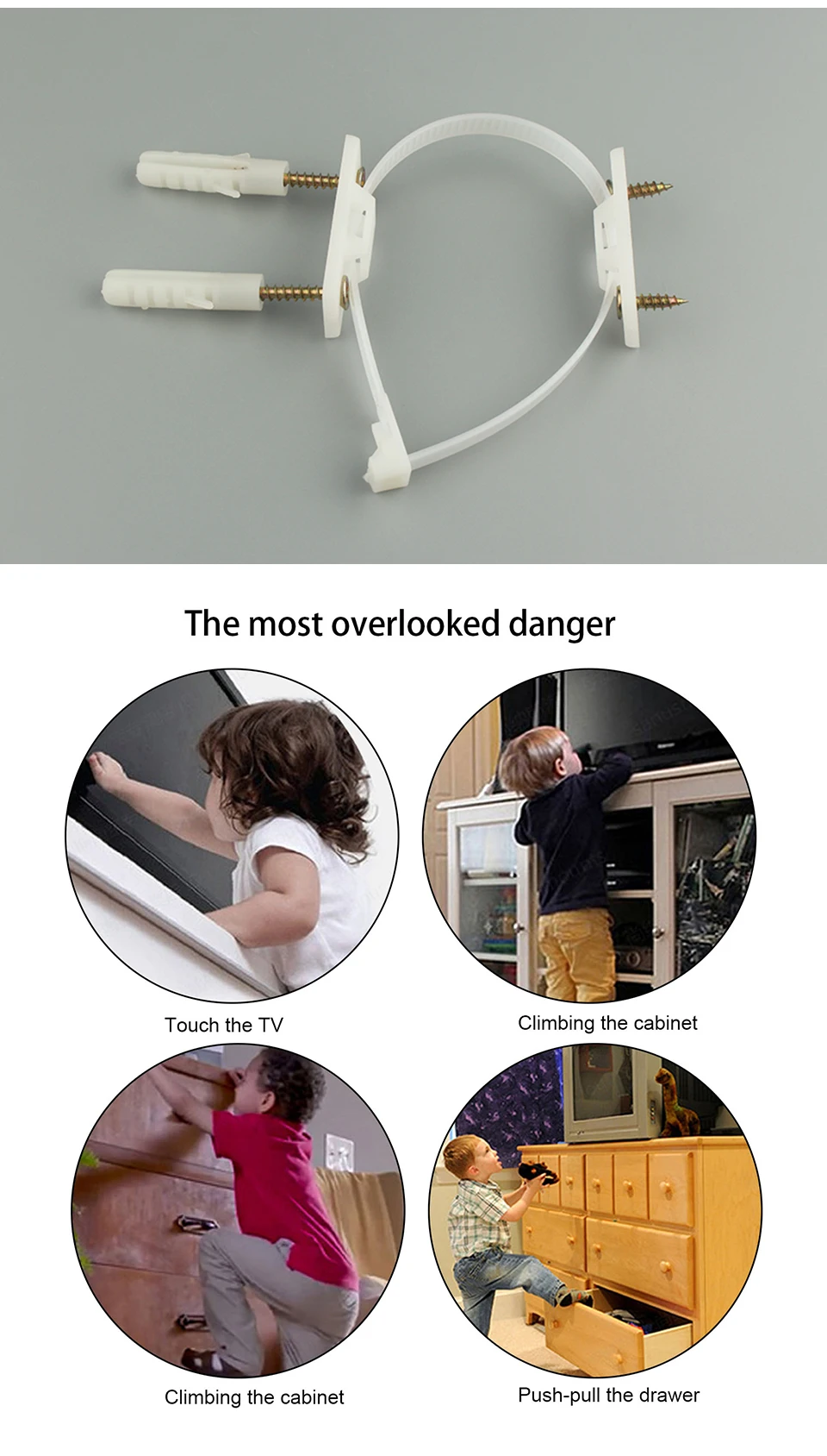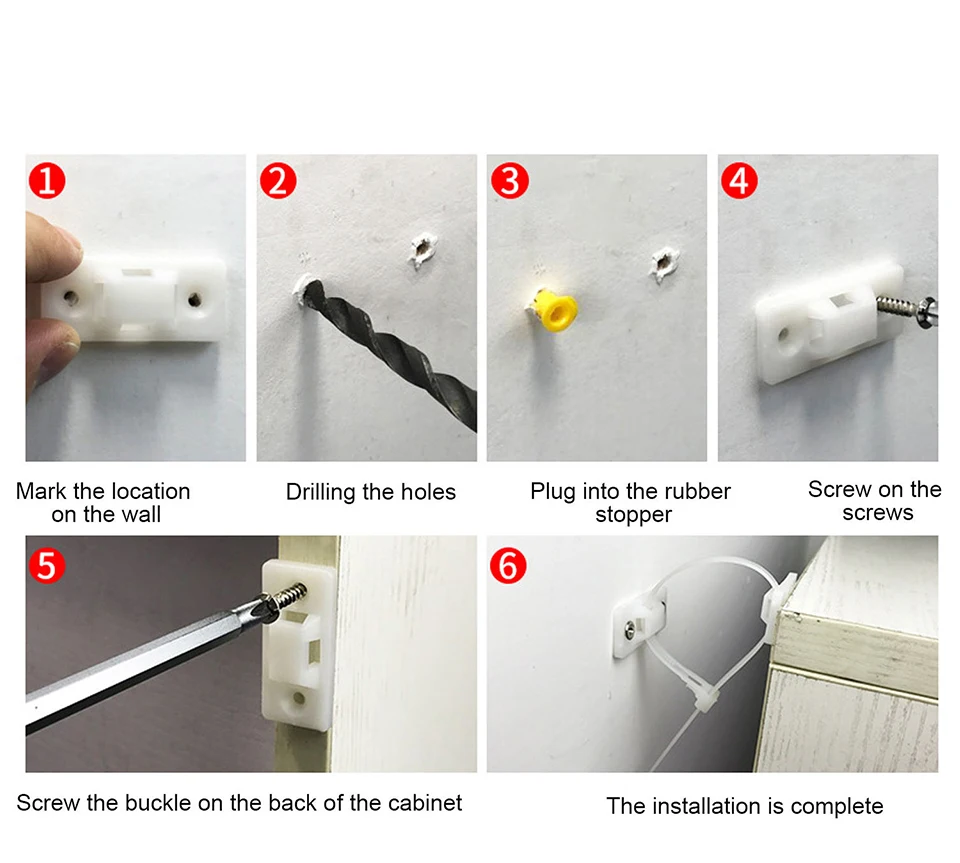 Предназначен для защиты ваших детей и домашних животных от возможных повреждений, вызванных падением мебели. Содержимое 1 набора: 1 ремешок с защитой от наконечников, 2 пряжки с защитой от падения, 2 Расширительных винта и 4 самореза, всего 6 комплектов. Высококачественный нейлоновый материал, прочный, долговечный, высокая прочность, нелегко сломать, грузоподъемность до 30 кг. Легко установить, просто нужно просверлить отверстия и установить винты, затем установить ремешок для мебели с защитой от наконечников. Подходит для шкафов, комодов, комодов, тумбочек под телевизор, шкафов, книжных полок и т. д.