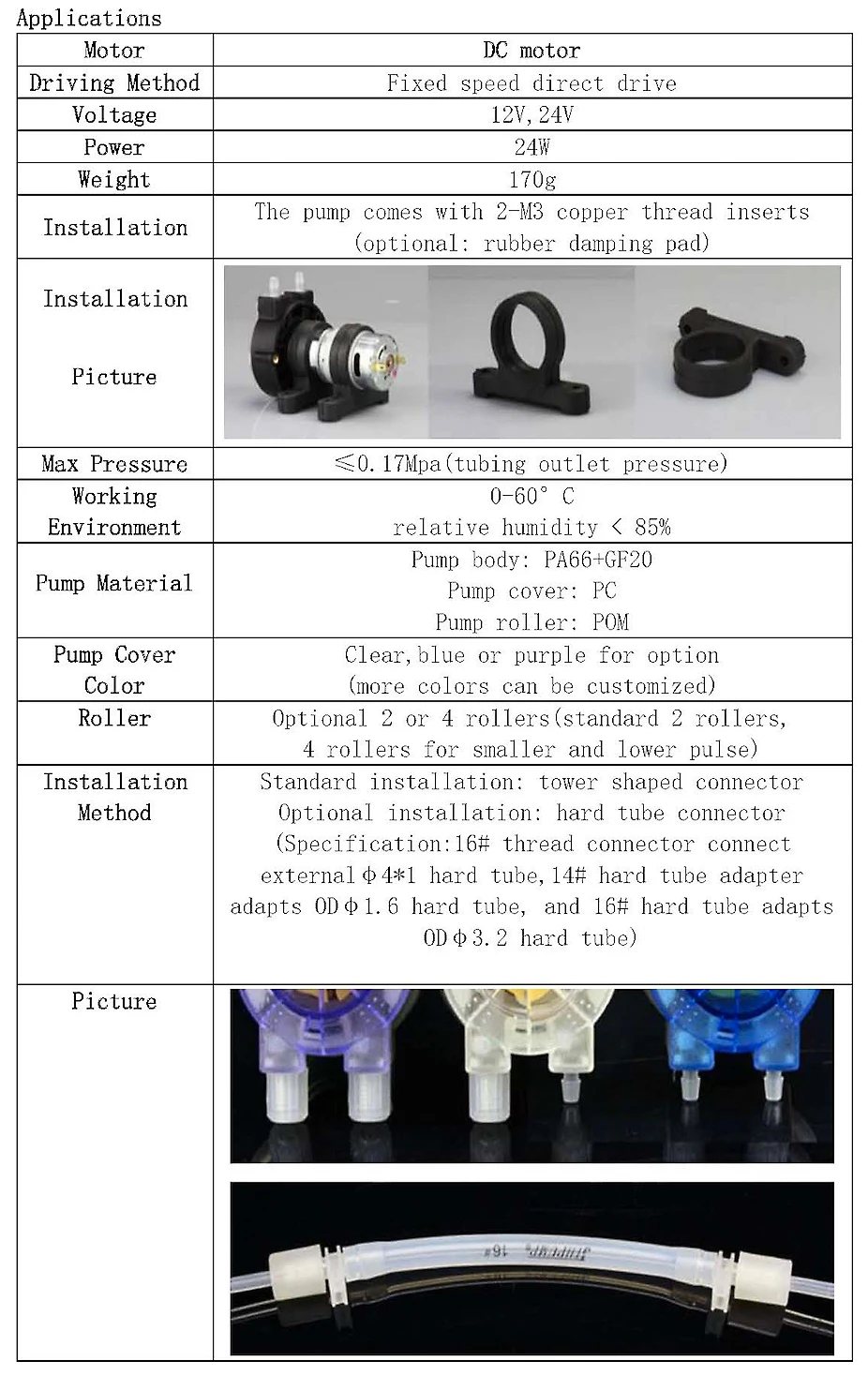 Применение 1. Медицинское использование: для переноса жидкости, отбора проб, дозирования 2. Использование химической инженерии: Анализ образцов, дозирующая жидкость 3. Чернильный принтер: для переноса чернил, очистки трубопровода 4. Лабораторное Использование: дозирование жидкости, извлечение жидкости, 5. Напитки: дозирование, наполнение 6. Использование окружающей среды: передача и отбор проб сточных вод 7. Использование фабрики: для дозирования жидкости 8. Использование семьи: полив цветка, орошение сада