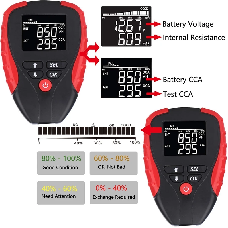 Тестируйте и анализируйте батареи 12 В, обеспечивают необходимые и полезные результаты для состояния батареи: фактический CCA, напряжение, внутреннее сопротивление, емкость или процент жизни, легко понять и использовать даже для начинающих.