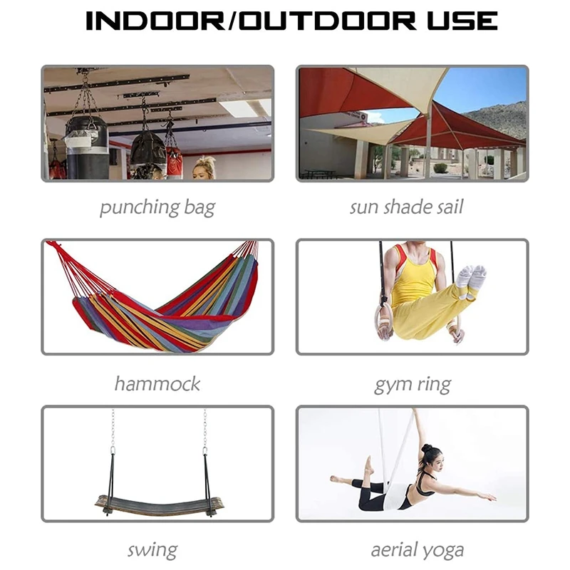 Широкий спектр использования: для внутреннего и наружного использования, подходит для бетонного потолка и деревянных балок, лучшее решение для крепления на все подвесные ремни и тренажеры сопротивления, комплект качелей гамака, Олимпийские кольца, боевые веревки, качели для йоги, оборудование для бокса.