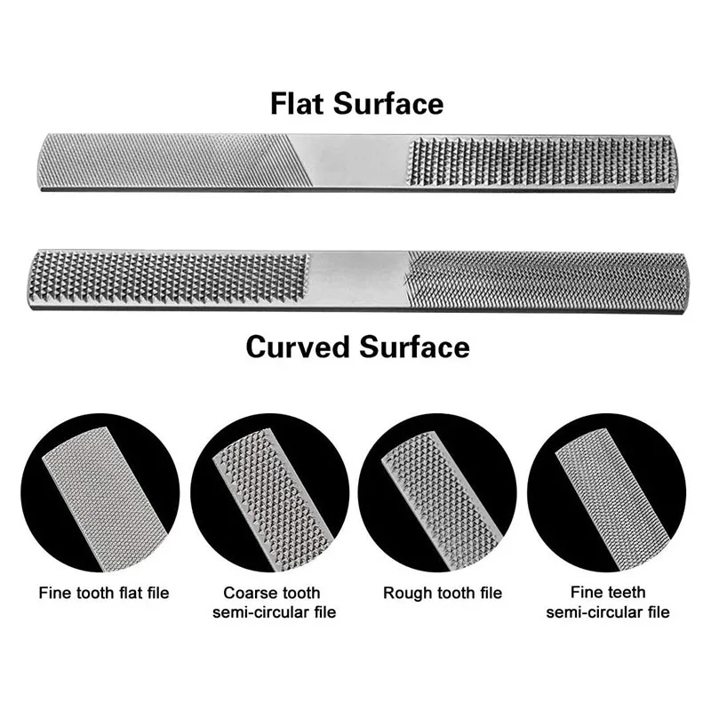 [Надежный и эффективный]-плоские шлифовальные лезвия гладят края и затачивают лезвия. Полукруглый второй режущий файл разглаживает внутреннюю поверхность контурного отверстия. Плоские деревянные пилки обрабатываются деревом, кожей, мягкими металлами и мягкими пластиками. Полукруглый деревянный файл примерно формирует внутренние контуры дерева, кожи, мягкого металла и мягкого пластика.