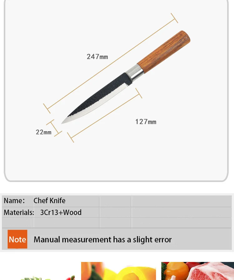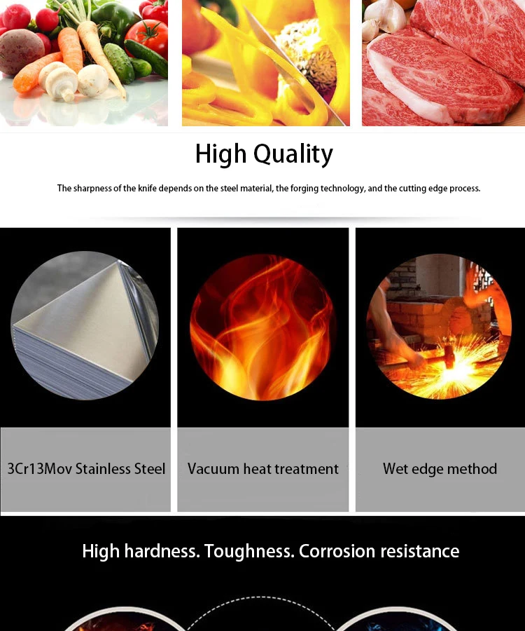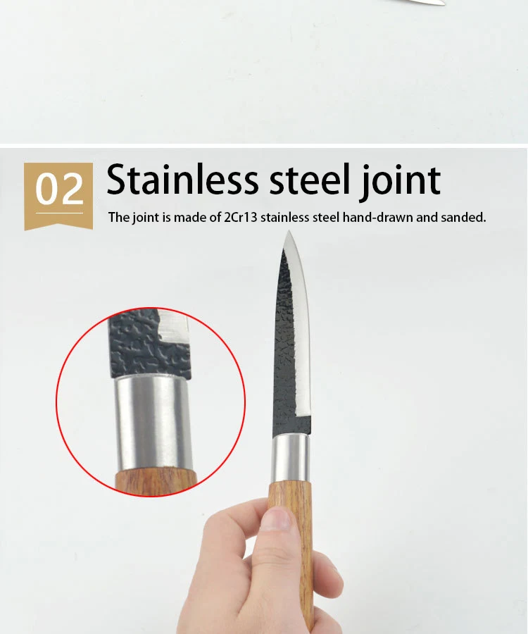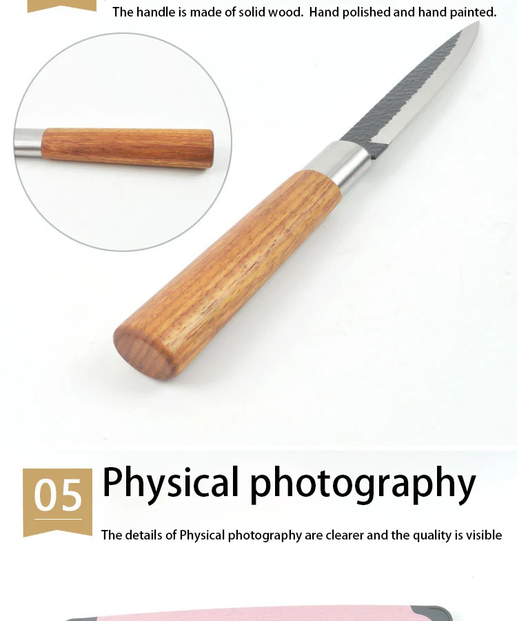 Ножи введение: 5 дюймов/машина для очистки овощей Ножи (лезвие поверхность дарит ощущение еще молоток рисунком + черные антипригарное покрытие) Материал: нержавеющая сталь 3Cr13mov Твердость: 52-54 HRC Ремесло: ручная работа Характеристики: антипригарный, легко режется, очень острый, высокая твердость, высокая прочность, прочный, высококачественный, супер антикоррозийный, светильник и т. Д. Обратите внимание: 1. Пожалуйста, поместите нож вдали от места, куда дети могут добраться. 2. Пожалуйста, очистите и высушите нож после использования, и поместите его в сухое место или устройство. 3. Лезвие очень остро, пожалуйста, не используйте пальцы, чтобы проверить его остроту.