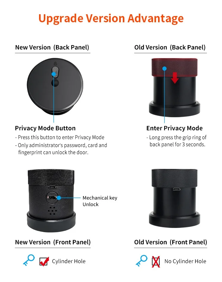 1. Доступ с помощью приложения Bluetooth, M1 карты, отпечатков пальцев, кода пропуска, браслета или ключа 2. Совместимость с различными врезными деталями для 99% дверей. Одноместный latch60/70, Европейский 4585/ 6085/ 6072 / 5572 3. Биометрический датчик отпечатков пальцев с одним касанием на считывателе. Сканер отпечатков пальцев автоматически проснется после того, как вы поместите палец на него и удобно расположить, чтобы сопровождать ваше естественное положение руки. 4. Резервный USB внешний интерфейс источника питания, в чехол питания. 5 двухсторонняя ручка свободного стиля. 6. Водонепроницаемая Резиновая конструкция, которая хорошо подходит для наружной двери.