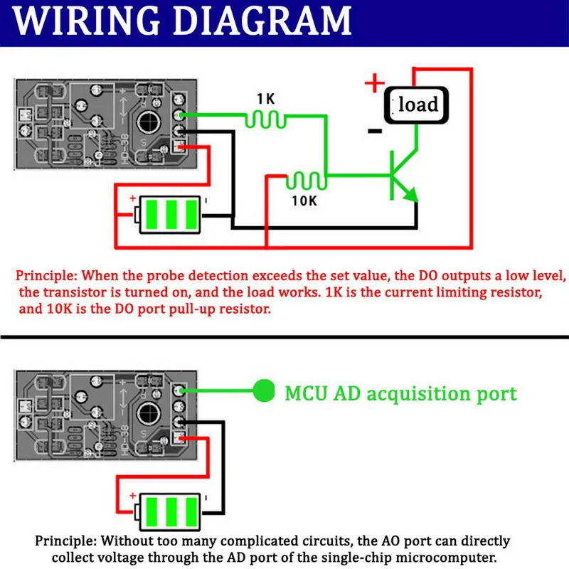 <Выход аналогового значения: порт AO на датчике влажности почвы выводит аналоговое значение (напряжение), И вы можете получить данные в реальном времени через AD порт вашего микрокомпьютера с одним чипом (MCU).