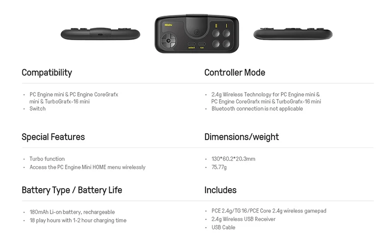 2,4G беспроводной геймпад для вашего ПК двигателя мини, turbografx-16 мини, ПК двигатель coregrafx мини-система Совместимость Nintendo Switch с usb-приемником 2,4G (входит в комплект) В комплект входит usb-приемник 2,4G Без лагов и перезаряжаемая Встроенная литий-ионная батарея Включает контроллер 2,4G, usb-приемник 2,4G и usb-кабель