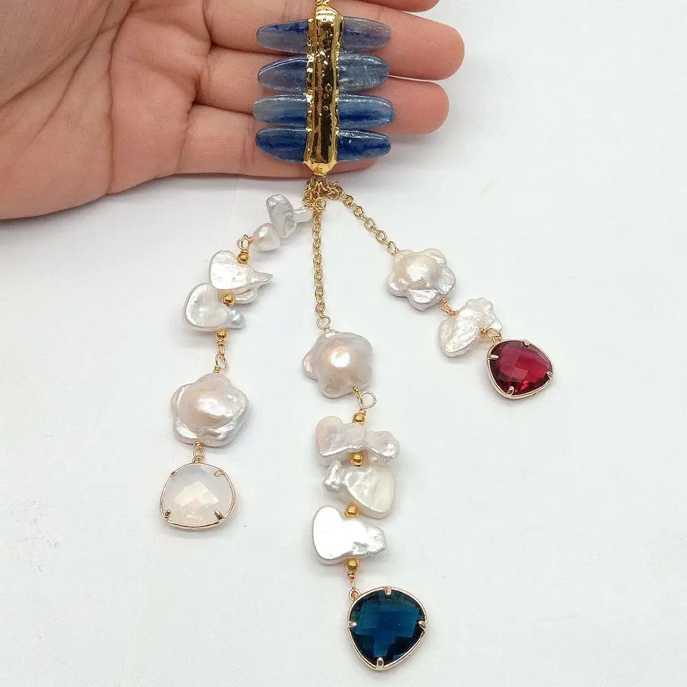 Информация о драгоценных камнями: Пресноводный Культивированный жемчуг, белый жемчуг Кеши, многоцветный кристалл, кулон кианита, хорошее качество, высокий блеск!