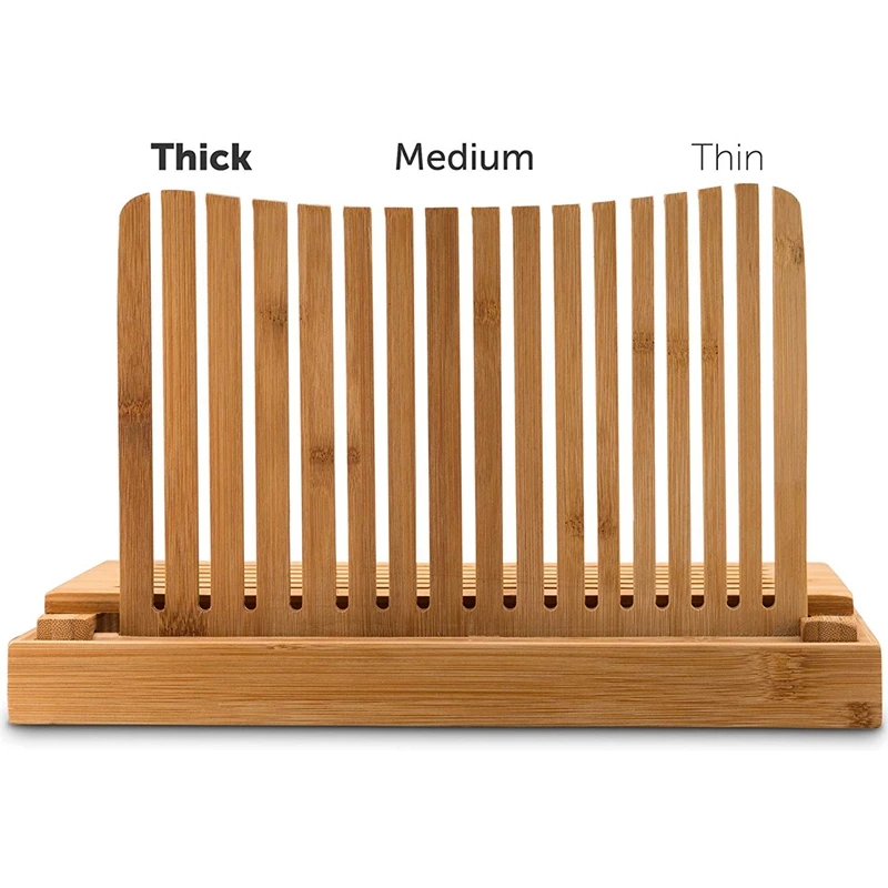 Направляющая для равномерной нарезки-эта бамбуковая Хлеборезка обладает замечательной способностью равномерно нарезать ломтики хлеба. Мы рекомендуем использовать 10-дюймовый нож для хлеба, чтобы нарезать ровные ломтики. Стороны рифленые, чтобы направлять нож для хлеба и регулировать, это означает, что вы можете выбрать из 4 ломтиков толщиной, чтобы получить толстые или тонкие ломтики