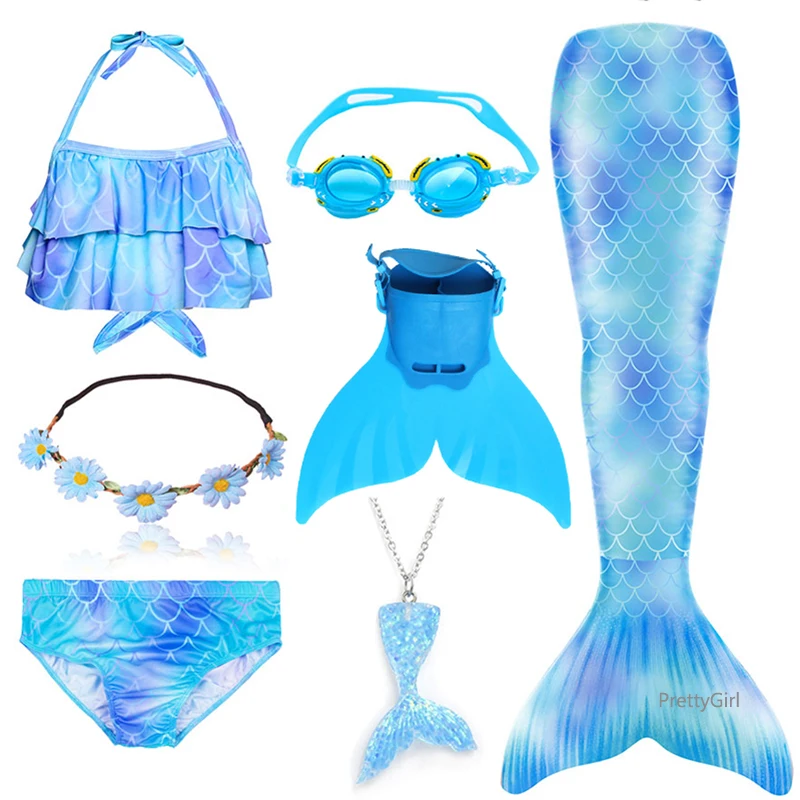 7 шт.: 1 * платье с хвостом русалки + 1 * бюстгальтер + 1 * шорты + 1 * гирлянда + 1 * ожерелье + 1 * монофин + 1 * очки для плавания