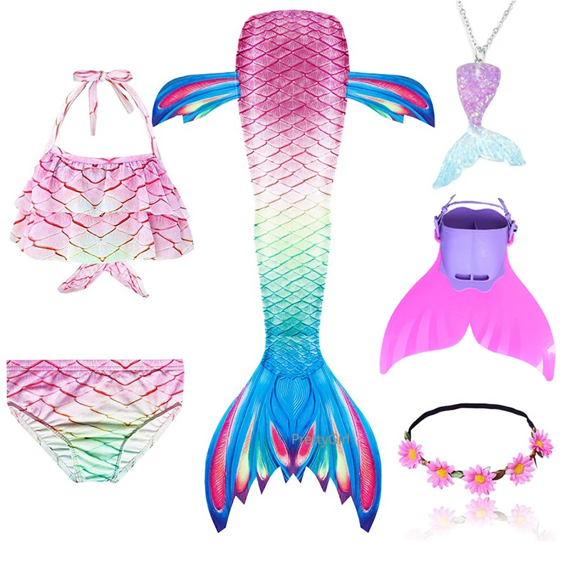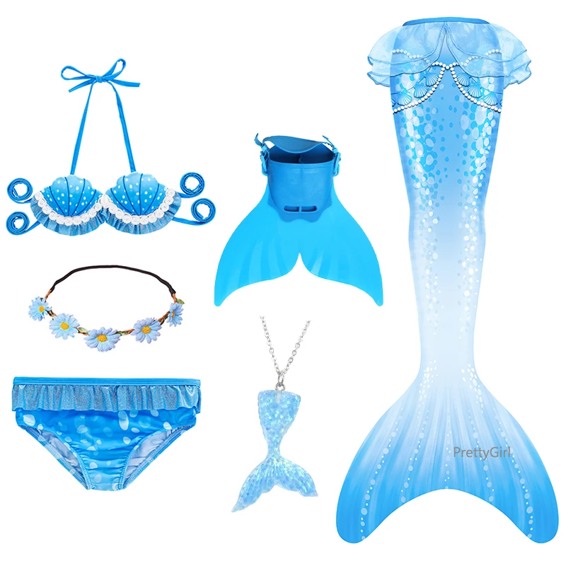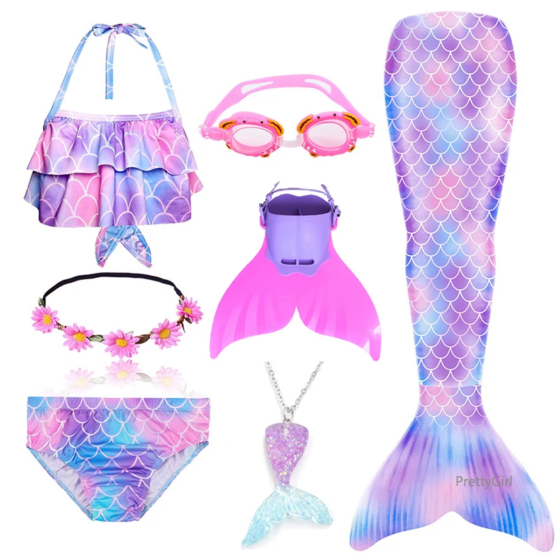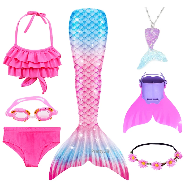7 шт.: 1 * платье с хвостом русалки + 1 * бюстгальтер + 1 * шорты + 1 * гирлянда + 1 * ожерелье + 1 * монофин + 1 * очки для плавания