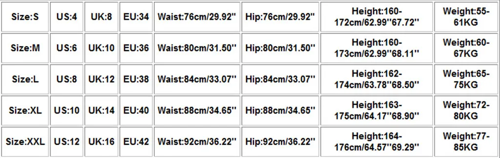 Размеры Свяжитесь с нами Великобритания ЕС Обхват талии Обхват бедер Высота Вес S 4 8 34 76 см/29,92" 76 см/29,92" 160-172 см/62,99 ''67.72'' 55-61 кг М 6 10 36 80 см/31,50'' 80 см/31,50'' 160-173 см/62,99 "68 года. 11" 60-67 кг L 8 12 38 84 см/33,07'' 84 см/33,07'' 162-174 см/63,78 "68.50'' 65-75 кг XL 10 14 40 88 см/34,65'' 88 см/34,65'' 163-175 см/64,17 "68.90'' 72-80 кг XXL 12 16 42 92 см/36,22'' 92 см/36,22'' 164-176 см/64,57 "69.29 дюймов 77-85 кг