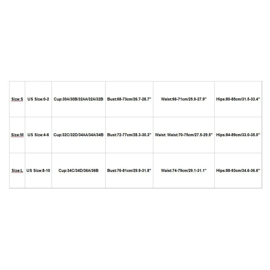 Размер Американский размер Чашка Бюст Талия Бедра S 0-2 30A/30B/32AA/32A/32B 68-73 см/26,7-28,7" 66-71 см/25,9-27,9" 80-85 см/31,5-33,4" М 4-6 32C/32D/34AA/34A/34B 72-77 см/28,3-30,3" Талия: 70-75 см/27,5-29,5" 84-89 см/33,0-35,0" L 8-10 34C/34D/36A/36B 76-81 см/29,9-31,8" 74-79 см/29,1-31,1" 88-93 см/34,6-36,6"