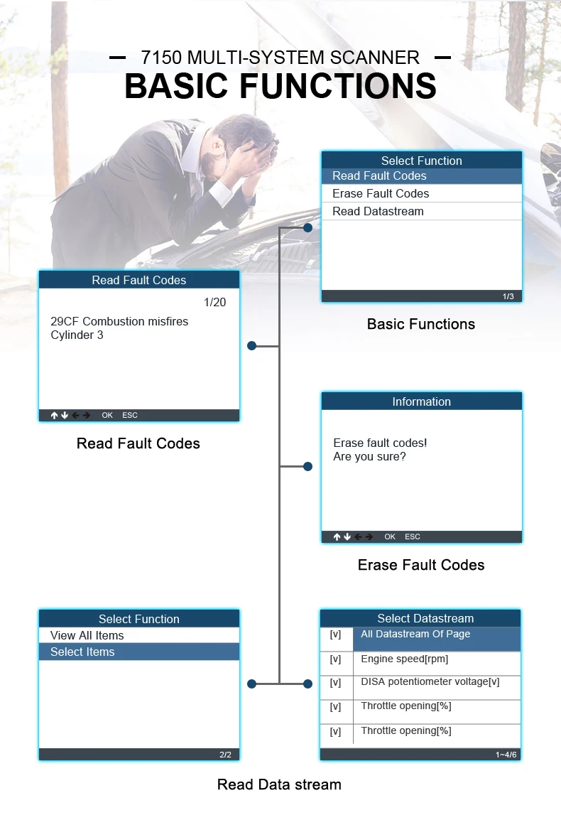 1. Чтение и очистка кода неисправности 2. Потоковые данные в реальном времени, информация о транспортном средстве 3. Подготовка I/M
