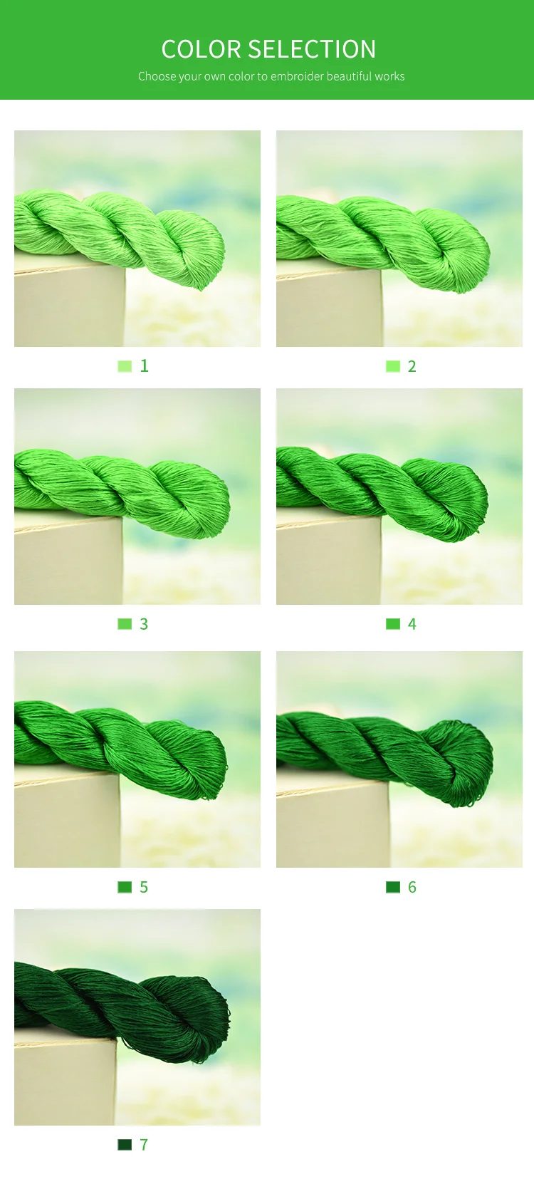 400 м чистый цвет вышивки Нитки/поделки, ручная вышивка/аксессуары ручной работы/полная зеленая серия Особенности: 1.100% шелк и высокое качество, подходит для Сучжоу ручной вышивки. 2. Длина: 400 метров (20 метров/маленький кусок) 3. У вас есть семь цветов на выбор 4. Пожалуйста, обратите внимание, что в зависимости от дисплея, продукт может производить некоторые различия в цвете, пожалуйста, знать и понять эту ситуацию. В комплект входит: 1 шт. (включая 20 маленьких штук)