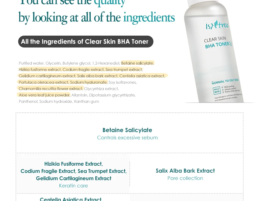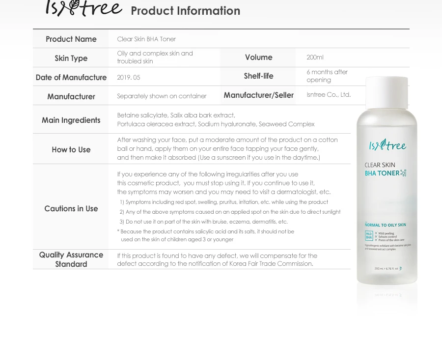 Мягкий и гладкий Тонер, который устраняет ненужные омертвевшие клетки кожи, отходы кожи и черные точки с BHA. Комплекс морских водорослей Помогает нормализовать секрецию потожиц, естественным образом осветляет тусклый и темный тон кожи. Натуральные успокаивающие ингредиенты (белая ива, центелла азиатская) обеспечивают комфорт для чувствительной кожи после отшелушивания. Как использовать Возьмите необходимое количество на ватный тампон или руки и слегка погладьте кожу, чтобы помочь впитывать. Информация о продукте Бренд: Isntree Все типы кожи Объем: 200 мл Сделано в Корее Состав Нет