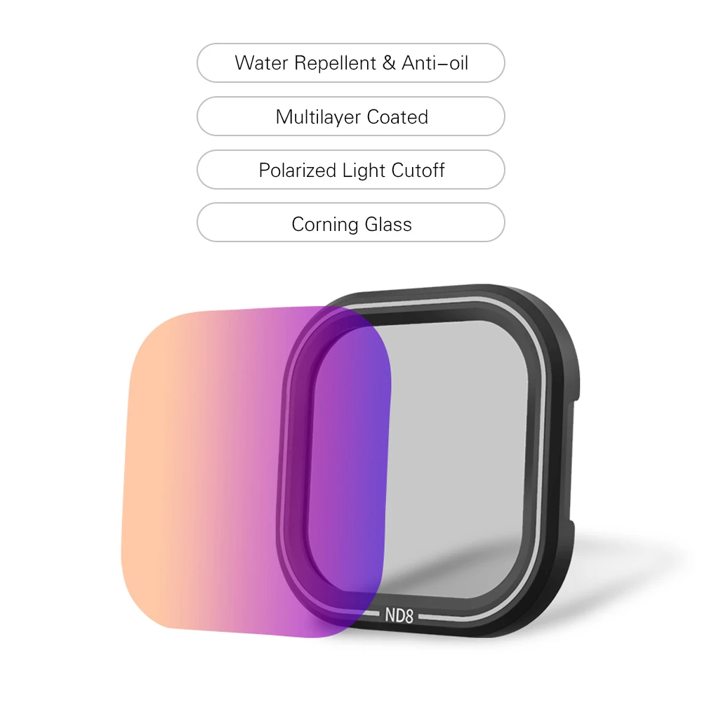 Комплекты фильтров TELESIN предназначены для объектива экшн-камеры, точно совместимы с GoPro Hero 8 Black, в том числе 4 шт. фильтров: CPL, ND8, ND16, ND32.