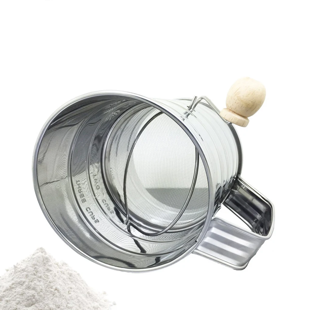 Способный удерживать до 3 чашек муки, этот сито для муки сэкономит вам время во время напряженного времени в вашей пекарне или домашней кухне.