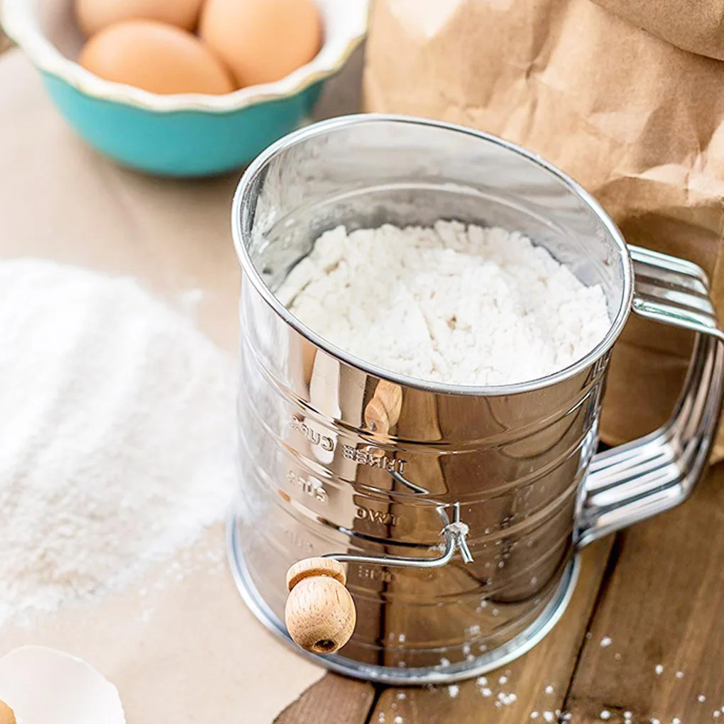 Деревянное сито для муки с рукояткой плавно работает роторный мешалка, чтобы аккуратно аэрировать муку или сахарную глазурь, чтобы оставить тонкий, мягкий порошок.