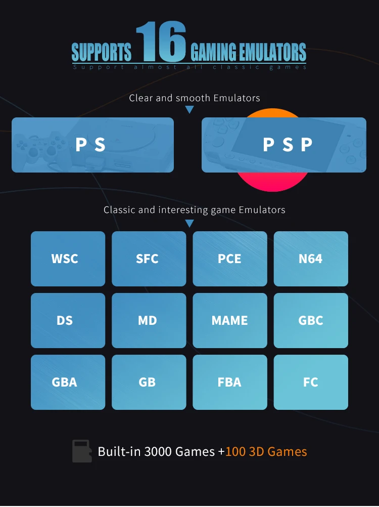 12-жильная Процессор и без лагов. Память 4G + 32G. Поддержка PS/PSP/WSC/SFC/PCE/N64/DS/MD/MAME/GBC/GBA/GB/FBA/FC, и вы можете сохранить ход игры в любое время. Поддержка турбоохлаждения. Это значит, что вы будете непобедимы и счастливы играть в игру! Если вы используете нашу официальную подходящую ручку, вам не нужно устанавливать ее, но покупатели могут изменить ключи в соответствии с их собственными привычками.