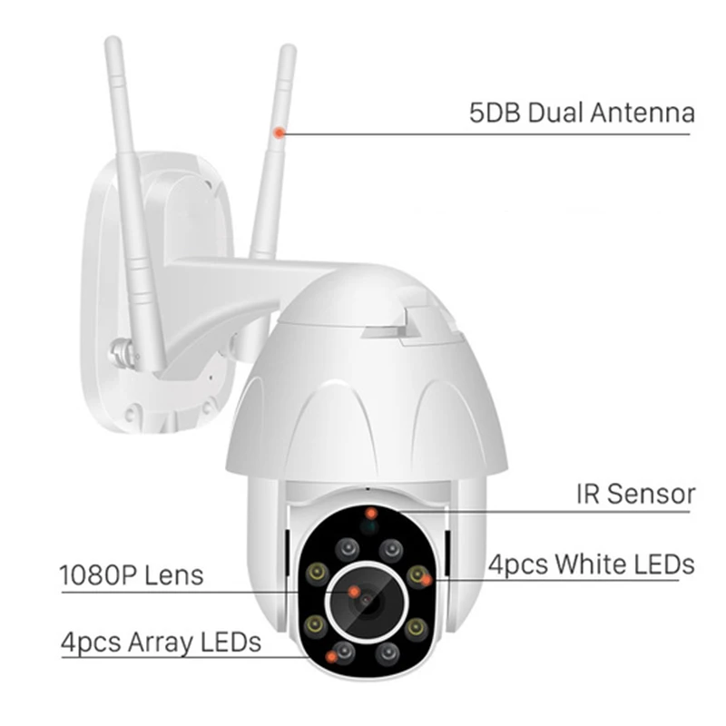 С помощью этого 1080p Водонепроницаемый открытый IP Камера, вы можете следить за своим открытый двор или крытый условия в режиме реального времени с Tuya Smart приложений. Полный цвет днем и ночью. Он поддерживает Google Home и Alexa.
