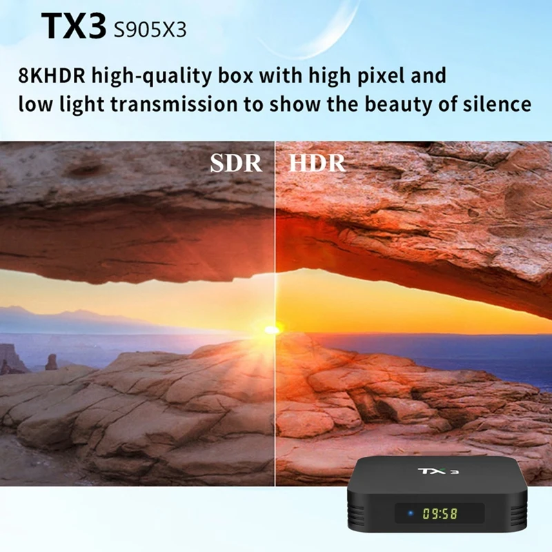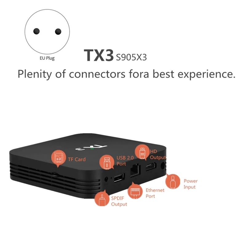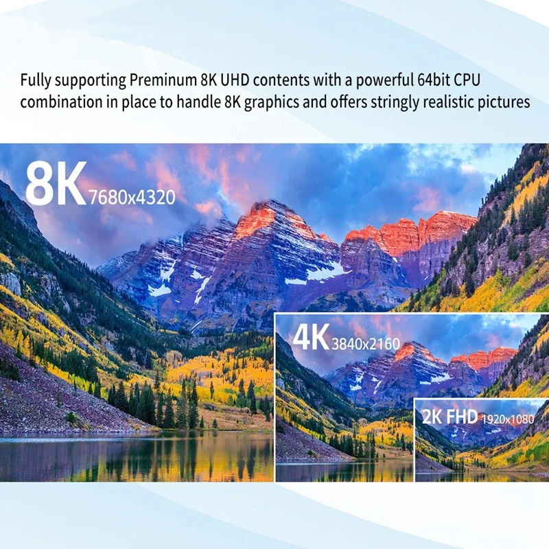 CPU: Amlogic S905X3 Quad Core ARM Cortex A55; GPU: ARM Mali-G31MP; OS: Android 9.0; - Support H.265, 8K 60pfs, HD 2.1, USB3.0;