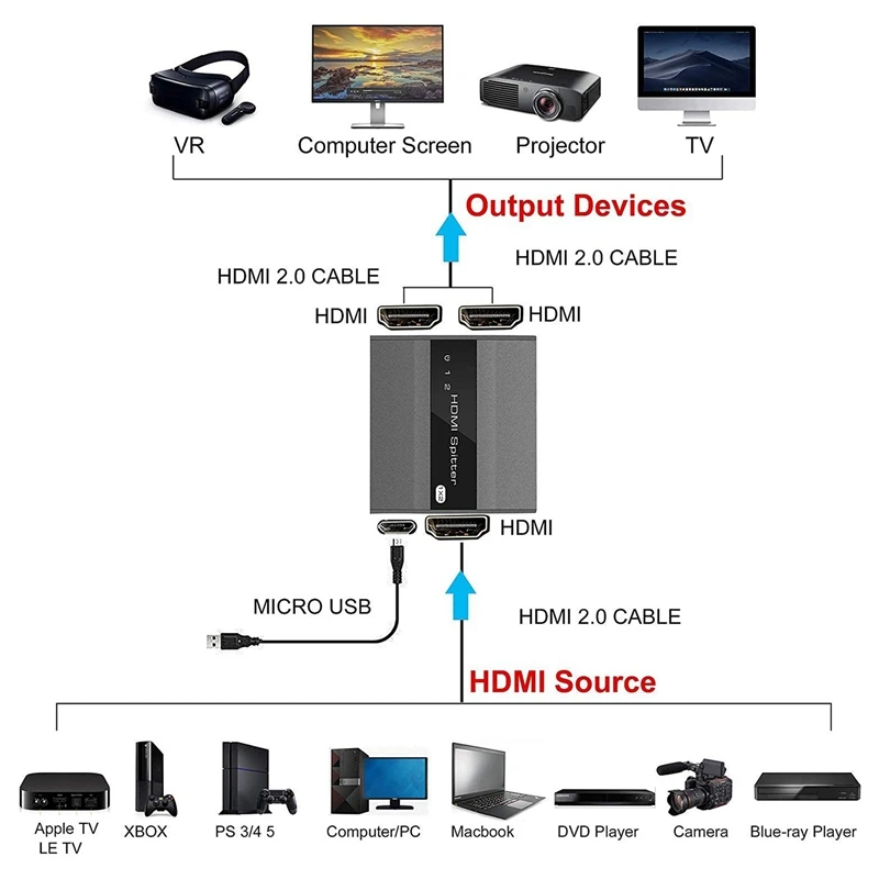 3). Если ваш источник HDMI (например, PS4) поддерживает 4K, используйте кабель HDMI 2,0 для подключения устройства источника 4K HDMI и сплиттера HDMI и дисплея, так как кабель HDMI 1,4 (или ниже) недостаточно для поддержки разрешения 4K.