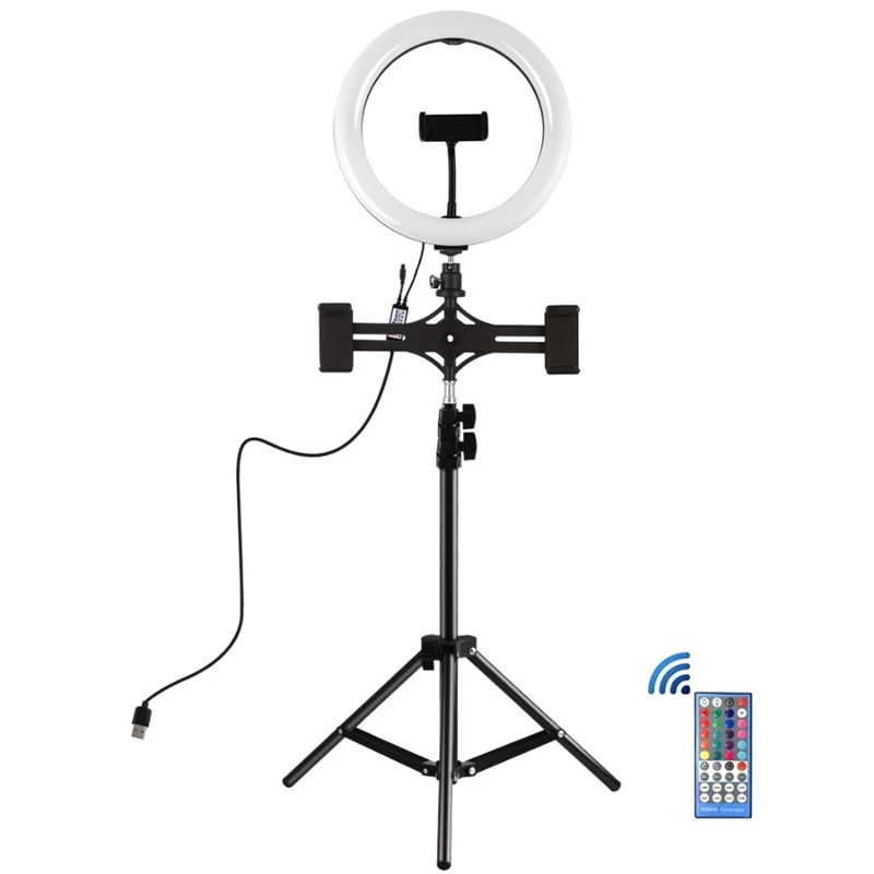 PULUZ PKT3052B 10,2 дюйма RGBW светодиодный светильник с регулируемой яркостью и двойной кронштейн для телефона, видео светильник, комплект для YouTube,Facebook Live,Twitch