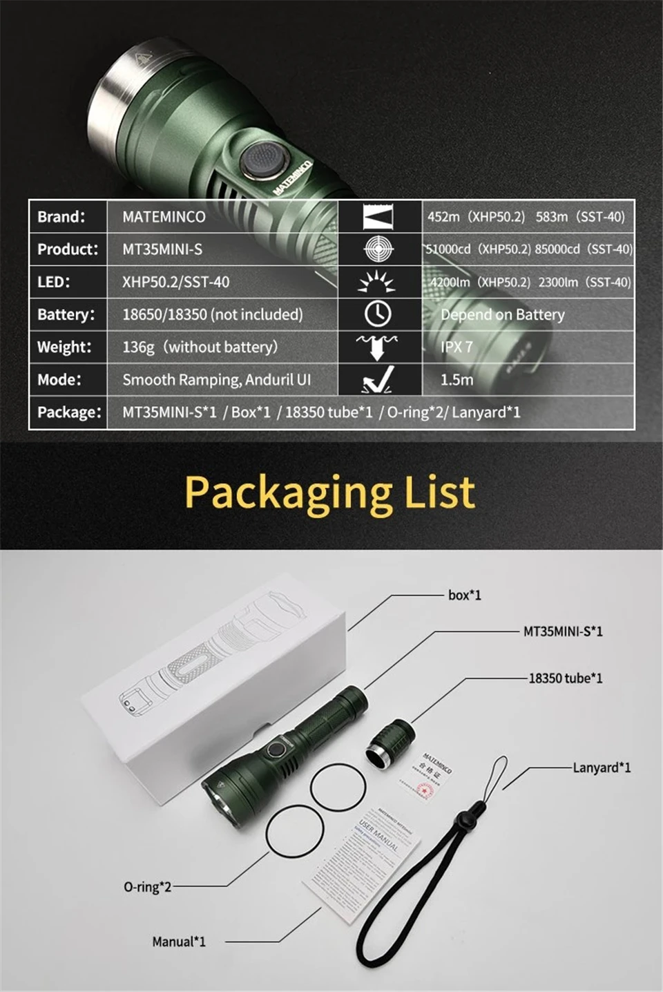 Название продукта: MT35mini-S Светодиодный: 1 * Cree XHP50.2 Материал: алюминиевый сплав Режим: Anduril пользовательского интерфейса Тип переключателя: Clicky Switch Расположение переключателя: корпус фонарика Аккумулятор: 1*18650/18350 батарея (не входит в комплект) Макс Выход: 4200lm Максимальная интенсивность луча: 51000cd Максимальное расстояние луча: 452 м Отражатель: гладкий отражатель из алюминиевого сплава Цвет: черный Ударопрочность: 1 м Характеристики: светодиодный RGB Aux дизайн, usb-зарядка 5V2A Type-C Класс водонепроницаемости: IPX7 Вес: 136 г (аккумулятор в комплект не входит) Размер: 144,8 мм * 43,5 мм * 25,5 мм (длина * диаметр головки * диаметр корпуса, 18650 размер)