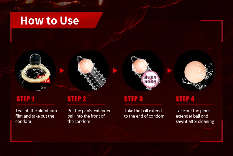 1. Оторвите алюминиевую пленку и выньте презерватив 2. Поместите расширитель пениса в переднюю часть презерватива 3. Возьмите мяч до конца презерватива 4. Выньте шарик расширителя пениса и сохраните его после чистки