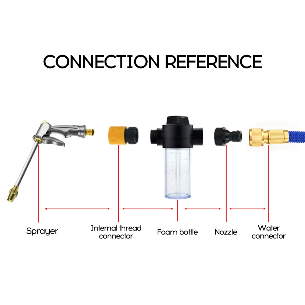 Набор распылителей-распылитель высокого давления и многоразовый режим, антикоррозийный и прочный для полива сада и очистки автомобиля. Шланг может расширяться до 3 раз при давлении воды. И пенная бутылка может производить богатую пену для высокой эффективности.