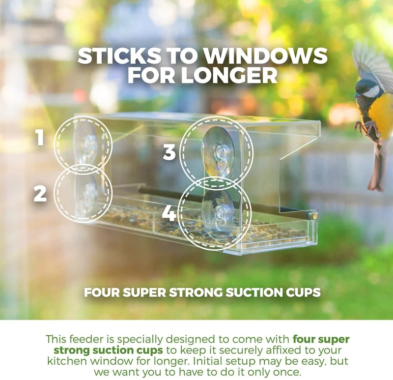 Прилипает к окнам дольше-где большинство кормушек поставляются только с 3 присосками с умеренной адгезией, этот питатель специально разработан, чтобы иметь четыре дополнительные Крепкие присоски, чтобы держать его надежно прикрепляется к вашему кухонному окну дольше. Первоначальная настройка может быть легкой, но мы хотим, чтобы вы сделали это только один раз.