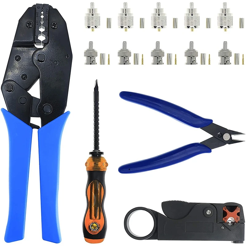 Инструмент для обжима: коаксиальный обжим-это высококачественный профессиональный инструмент для обжима плоскогубцев, мощный Трещоточный обжимной инструмент, штамповка. 0255, съемная головка, Качественная ручка для лучшего контроля, новый сверхмощный Трещоточный обжимной инструмент для коаксиальные соединители с размером кабеля RG-58, 59, 62, 8x, 141, 142, LMR195, 200, 240. Зачистки проводов: двойные лезвия, зачистки кабелей, полностью регулируемые и сменные лезвия