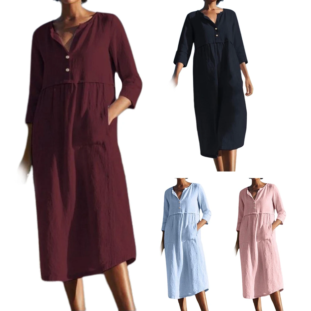 Женское однотонное платье средней длины с карманами и пуговицами из хлопка и льна