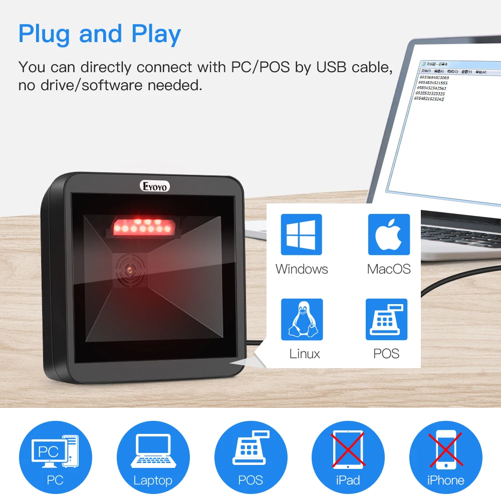 Eyoyo 2D Настольный сканер штрих-кода, Всенаправленный беспроводной проводной USB большой считыватель штрих-кодов, 1D qr-экран штрих-кодов сканирование автоматический сканер платформы зондирования для супермаркета библиотеки розничного магазина
